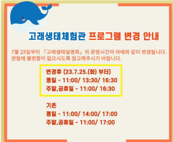 돌고래들이 먹이를 먹으며 운동하는 모습을 관람할 수 있는 설명회가 있더라고요. 저흰 이날 시간도 안 맞고 사람들도 많아서 보진 못했답니다. 운영시간은 아래 그림 참고하시면 됩니다.
