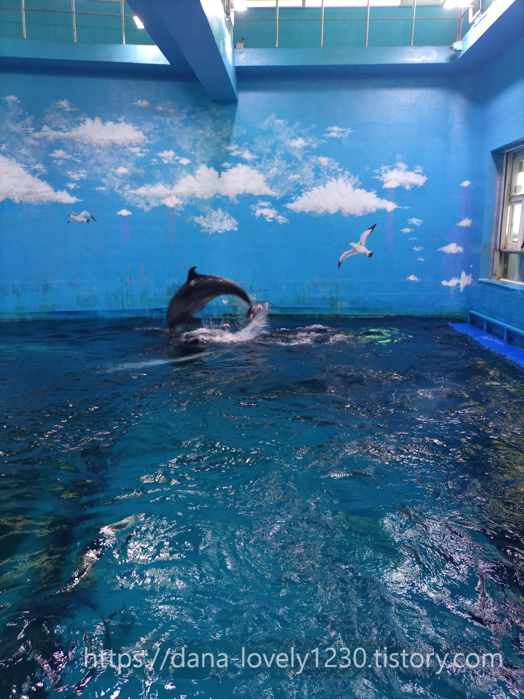 2층에 가면 실제 돌고래를 볼 수 있는데요~정말 신기하더라고요. 돌고래가 4~5마리 정도 있는 거 같기도 하고, 가까이서 보는데 크기도 정말 크고, 조금 무섭기도 하고, 좁은 수족관에 있는 돌고래가 안타깝기도 하고 여러 생각이 들더라고요.