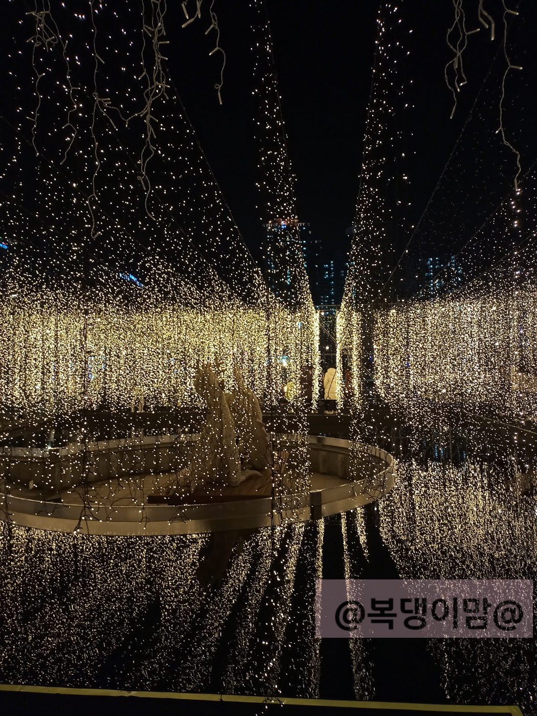 정확한 명칭은 '소망기원 복룡 거울 연못 빛축제' 인대요. 복을 주는 환상의 루미나리에 섬이라는 주제로 수직으로 내려오는 36만 개의 별조명과 거울처럼 반사된 풍경이 환상적인 분위기를 자아낸답니다. 또한 별조명 안으로 설치된 덧마루길을 따라 우주에 떠 있는 느낌을 경험해 볼 수 있다네요.